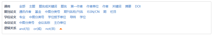 在统一检索的输入框内,用户可以选择想要限定的检索字段,目前共有5个可检索字段:题名、作者、作者单位关键词和摘要。