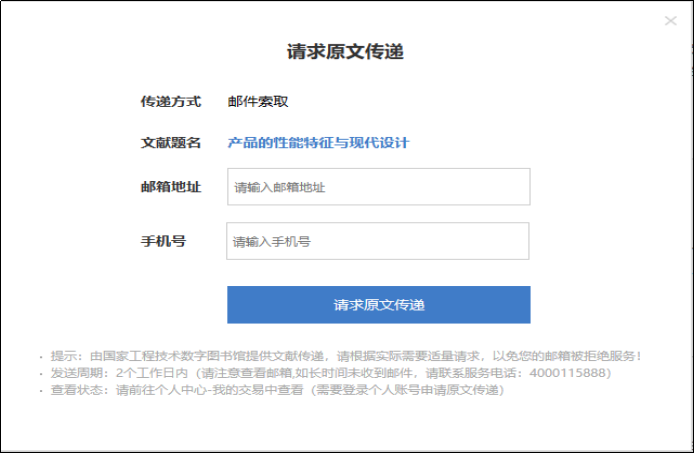 万方智搜除了提供本平台收录的资源外,还与国家科技图书情报中心(NSTL)、国家工程技术数字图书馆(ISTIC)合作,提供文献的原文传递服务。机构用户利用万方智搜检索到来自NSTL和ISTIC的资源,可以通过原文传递服务便捷快速的获取所需资源。