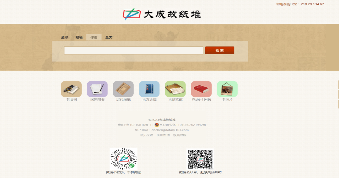 访问方式:图书馆主页—数字资源导航—校内访问—大成故纸堆—大成老旧刊全文数据库(https://laokan.dachengdata.com/index),或扫码登录。