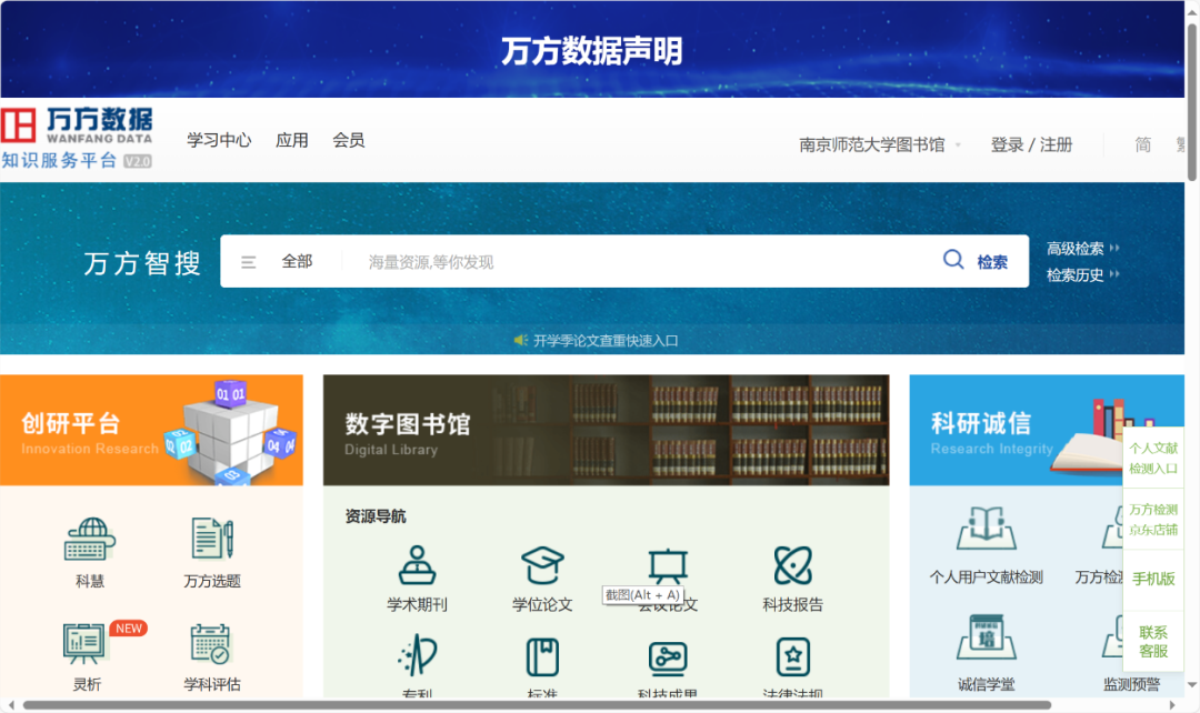 万方数据通过与国家科技图书文献中心、牛津大学出版社、剑桥大学出版社等数十家机构、出版社等合作,整合数亿条全球学术资源,集纳了期刊、学位论文、会议论文、专利、科技报告、成果、标准、法规、地方志、视频等十余种资源类型。中国学术期刊数据库是万方数据系列数据库之一,收录始于1998年,包含8000余种期刊,其中包含北京大学、中国科学技术信息研究所、中国科学院文献情报中心、南京大学、中国社会科学院历年收录的核心期刊3300余种,年增300万篇,每天更新,涵盖自然科学、工程技术、医药卫生、农业科学、哲学政法、社会科学、科教文艺等各个学科。