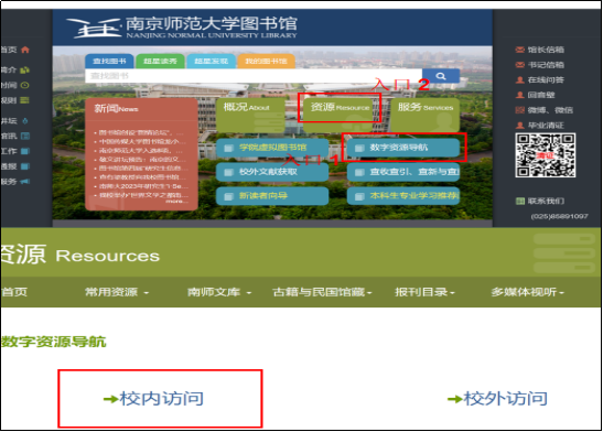 进入图书馆首页,直接选择【数字资源导航】,或在【资源】模块中选择【数字资源导航】,点击校内访问即可。