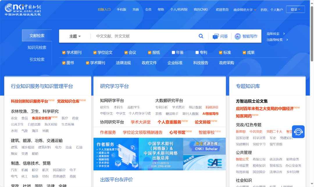CNKI中国知网是CNKI一站式检索平台,包括我馆订购的CNKI 22个数据库,主要资源有期刊、学位论文、会议论文、报纸、年鉴、图书、专利、标准、成果等。中国学术期刊网络出版总库是CNKI系列数据库之一,是目前世界上最大的、连续动态更新的中文期刊全文数据库。收录1915年至今(部分刊物回溯至创刊)国内8000多种学术期刊,全文文献总量6000余万篇。以学术、工程技术、政策指导、高级科普、行业指导及教育类期刊为主,内容覆盖自然科学、工程技术、农业、哲学、医学、人文社会科学等各个领域。