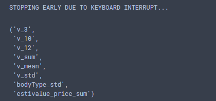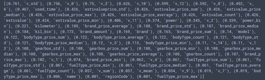 如果真的这样尝试一下,就会发现保留的特征里面, v_std, v_3, used_time, power, kilometer, estivalue等这些特征都在,虽然我们不知道v系列特征的含义,但是汽车使用时间,发动机功率,行驶公里, 汽车使用时间的分箱特征其实对price的影响都是比较大的。