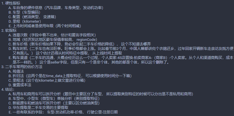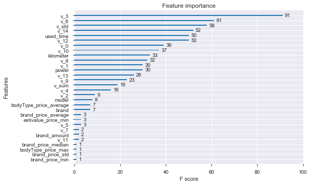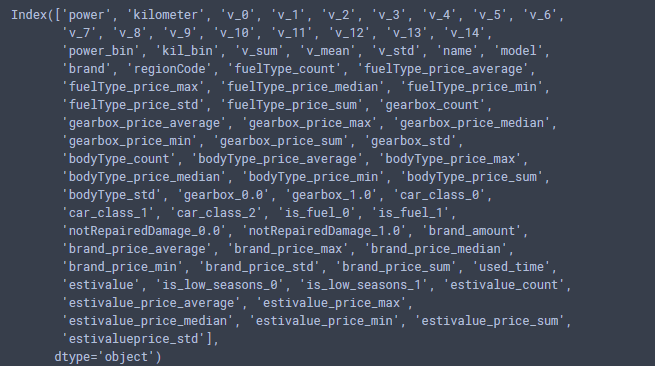 通过上面的步骤,特征工程就完成了。简单的梳理一下, 基于二手车的背景信息进行特征构造的,首先是构造的时间特征, 构造了使用时间,是否报废,使用时间分箱, 是否淡旺季等特征;然后是类别特征,构造了邮编特征,是否私用,是否新能源,是否微型车,并且还提取了大量统计特征;最后是数值特征,给kilometer分箱, 对V特征进行了统计等。