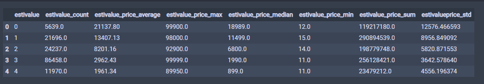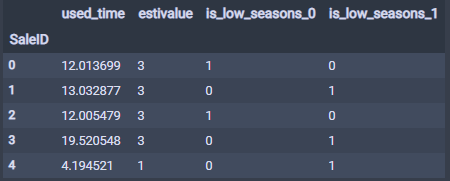 看一下最后的构造结果, 报废特征没有构造,因为发现了一个特点就是这里的数据10年以上的车会偏斜,所以感觉这个用10年作为分界线不太合适,只是提供一种思路。