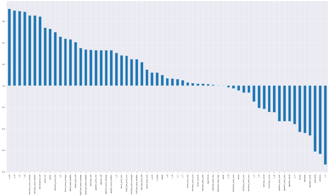 corr = select_data.corr(‘pearson’) # .corr(‘spearman’)plt.figure(figsize=(25, 15))corr[‘price’].sort_values(ascending=False)[1:].plot(kind=‘bar’)plt.tight_layout()