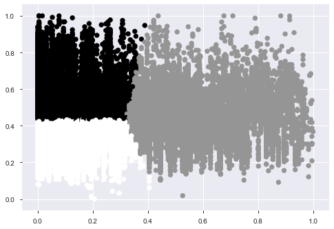from scipy.cluster.hierarchy import linkage, dendrogram#from sklearn.cluster import AgglomerativeClusteringfrom sklearn.cluster import KMeansac = KMeans(n_clusters=3)ac.fit(model_price_data)model_fea = ac.predict(model_price_data)plt.scatter(model_price_data[:,0], model_price_data[:,1], c=model_fea)cat_data_hot[‘model_fea’] = model_feacat_data_hot = pd.get_dummies(cat_data_hot, columns=[‘model_fea’])