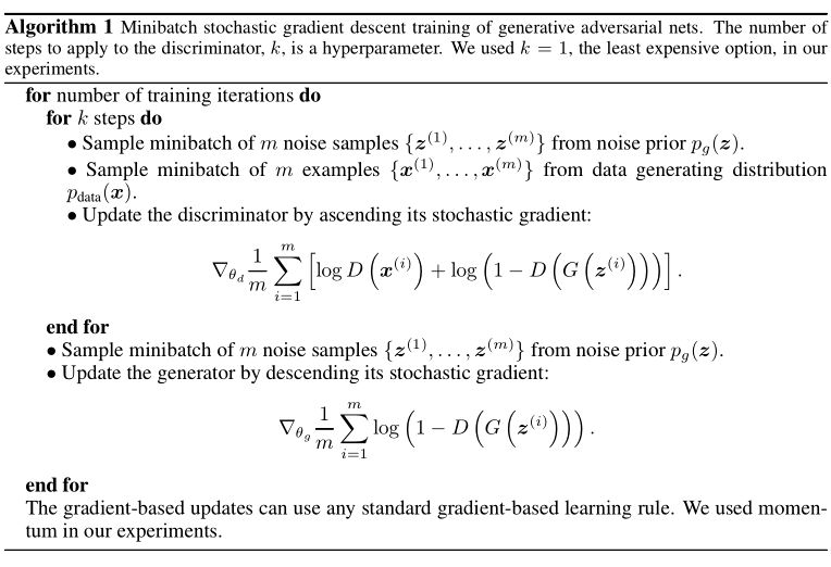 在这样一个训练目标下,通过对 G 和 D 分别求导就可以得到训练 GAN 的算法,如下:
