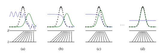 以下是一个 GAN 训练过程的实例,其中蓝线表示 D 的判断的分布,绿线表示 G 生成的图像的分布,黑点线表示真实图像的分布。可以看到,在训练的过程中,G 生成的图像的分布在慢慢向真实图像的分布靠拢,D 的判断的分布也逐渐接近全 1⁄2 的均匀分布。