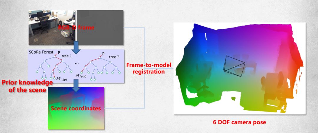 传统方法主要是和已知的帧进行匹配 (Random Ferns),而现在的方法主要是利用可学习的模型 (深度神经网络, 随机森林等) 的方式先计算出二维像素到三维世界的绝对坐标的关系. 然后再利用 RANSAC 的算法结合 PnP, Kabsch 的匹配算法计算出对应的位置。