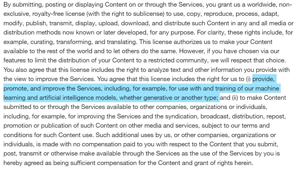 最近,社交媒体平台X(原推特)宣布了一项用户协议更新,即用户通过 X 平台发布的任何内容 (包括文字、图片、音频和视频等) 都将授予 X 免费使用,包括用于训练人工智能模型。
