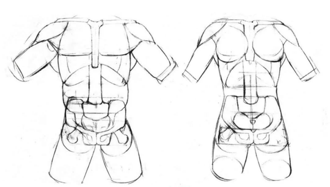 男性的胸腔是倒梯形,胯部是长方形,整体来看呈梯形。女性的胸腔是倒梯形,胯部是梯形,整体来看比较偏向长方形。