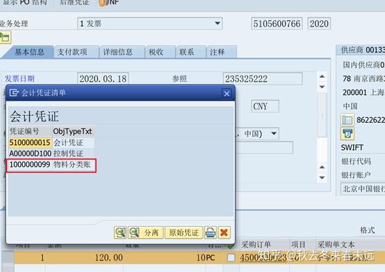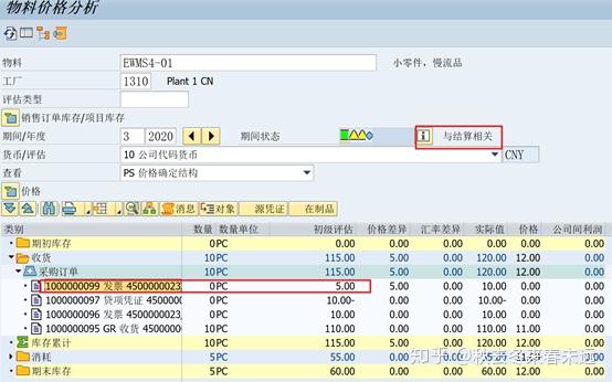 测试场景是物料为V价,采购10个,入库后发掉5个,发票校验时产生了10元的差异,此时因为系统库存不足,其中5元差异进入了差异。我们可以看出,物料分类账凭证是可以产生的,也就是说只要使用了物料分类账,不管是V价还是S价的物料,都会产生物料分类账凭证。