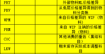 PRV/PRY用于和PRD的差异科目对抵,即差异科目归集的差异通过PRV/PRY(等同于差异转出科目),转出到的科目即COC和LKW。COC即销售成本-差异科目,LKW即库存差异科目。过账到LKW的凭证,下月初会自动冲回,类似于外币评估,作为下月的期初差异值,继续参与后续的分摊。如果LKW不配置,即想评估到原库存科目,可不配置LKW,而是在CKMLCP时执行步骤“过账清算”勾选“重估物料”,则可以对原库存科目进行重估。同理,也可以设置601/602为重估,从而重估原销售成本科目。只要选择“重估物料”,系统就会把实际价格更新到物料主数据周期单位价格,并把价格标识改为V,下月冲回对物料重估的部分,再把价格改为S。PRM建议设置为单独的在制品差异冲销科目,这个科目如果有余额,可反映为未分摊出去的在制品差异。WPM其实既标识在制品产生的科目,也标识在制品冲销使用的在制品科目,系统逻辑是分摊在制品差异时,从差异结转科目导WPM,冲销在制品差异时,从WPM再到PRM,然后从PRM再到其他科目(按照差异的流向和去处)。