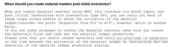 不过,根据note:/ /的说明,SAP推荐的做法是在创建物料以及导入历史采购订单后再激活物料帐(包括后台和前台,因为如果后台激活,前台不激活,则无法创建物料主数据),这样的话,个人认为则需要在创建物料,并搭建BOM/工艺后,对物料进行标准成本估算,然后再按照估算后的成本导入期初库存,此时再激活物料帐,则物料帐则自动初始化期初的实际成本构成,从而保证期初库存也是有实际成本构成的(561移动类型导入的库存此时视为库存的收货)。不过这样带来的问题,就是难免出现SAP中标准成本估算和实际导入老系统库存价格之间的差异,这个差异在国内企业中如果金额较大,则难以解释和处理,所以通常的做法还是期初使用和老系统价格一致的方式导入库存,后续产生的差异则由SAP物料帐处理。