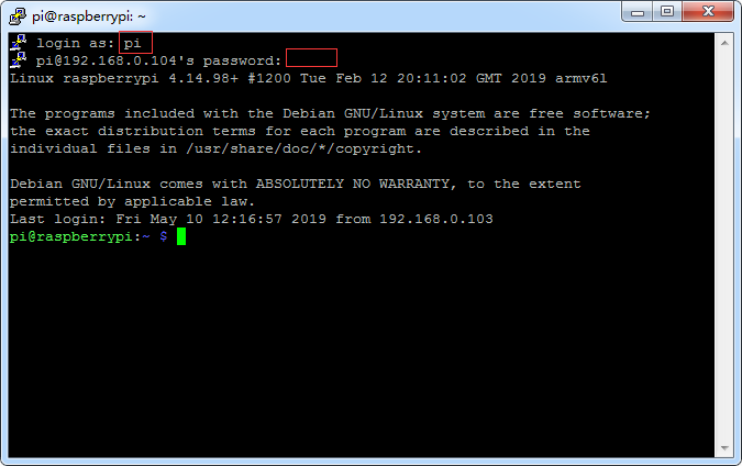 可以看到我们zero w的ip为192.168.0.104,然后使用ssh连接工具(推荐使用putty)连接树莓派,初始账户为pi,密码是raspberry。