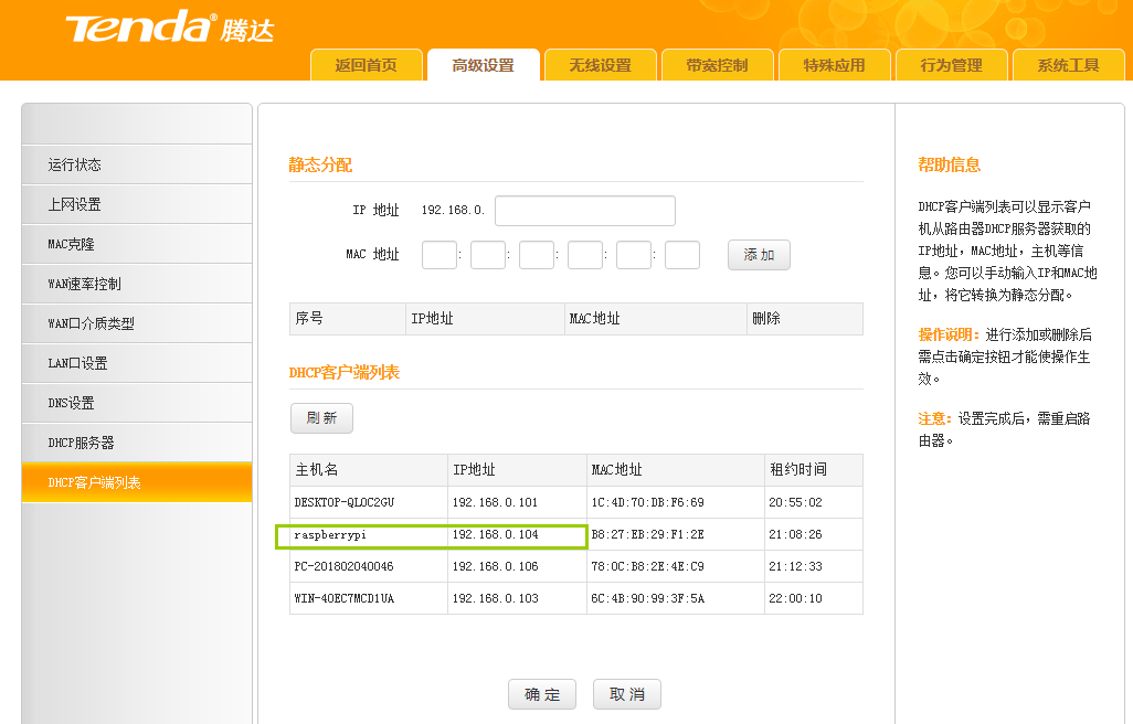 取出读卡器中的内存卡,然后插入到zero w中,使用一根usb安卓数据线连接电源(5V1A)即可。等待几分钟,期间我们的zero w的指示灯会一直闪烁,很正常,等待指示灯常亮的时候,我们去路由器上,查看一下树莓派的ip地址。