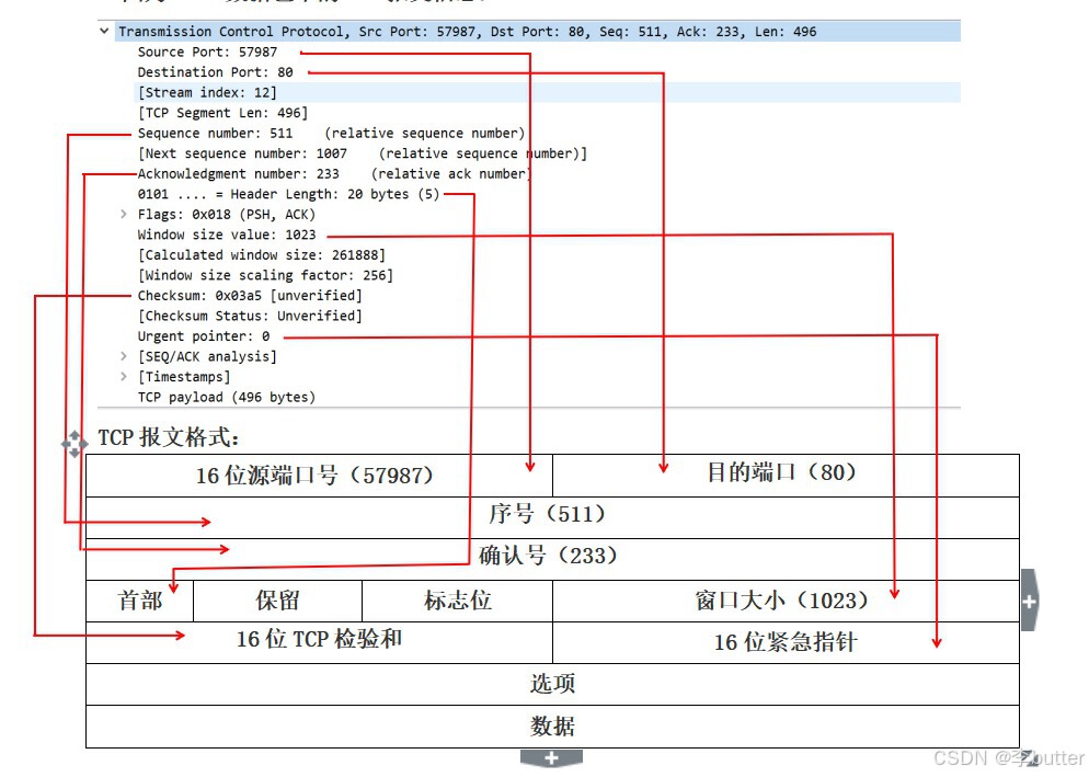 - 校验和: 占16位,用于对TCP报文段(包括首部和数据)进行校验,以检测数据传输过程中的错误。