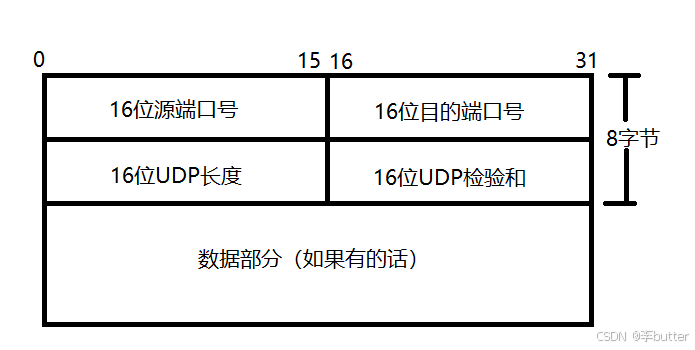 - 作用:表示整个UDP数据报的长度,包括UDP头部和数据部分。最小值是8,因为UDP头部的长度固定为8字节。