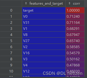 features_corr = numerical_corr.sort_values(ascending=False).reset_index() features_corr.columns = ['features_and_target', 'corr'] features_corr_select = features_corr[features_corr['corr']>0.3] # 筛选出大于相关性大于0.3的特征 print(features_corr_select) select_features = [col for col in features_corr_select['features_and_target'] if col not in ['target']] new_train_data_corr_select = train_data_scaler[select_features+['target']] new_test_data_corr_select = test_data_scaler[select_features]