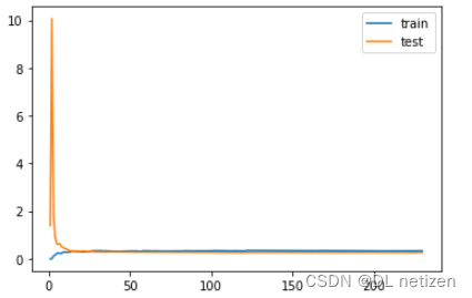 讯享网def plot_learning_curve(algo, X_train, X_test, y_train, y_test): """绘制学习曲线:只需要传入算法(或实例对象)、X_train、X_test、y_train、y_test""" """当使用该函数时传入算法,该算法的变量要进行实例化, 如:PolynomialRegression(degree=2),变量 degree 要进行实例化""" train_score = [] test_score = [] for i in range(10, len(X_train)+1, 10): algo.fit(X_train[:i], y_train[:i]) y_train_predict = algo.predict(X_train[:i]) train_score.append(mean_squared_error(y_train[:i], y_train_predict)) y_test_predict = algo.predict(X_test) test_score.append(mean_squared_error(y_test, y_test_predict)) plt.plot([i for i in range(1, len(train_score)+1)], train_score, label="train") plt.plot([i for i in range(1, len(test_score)+1)], test_score, label="test") plt.legend() plt.show()