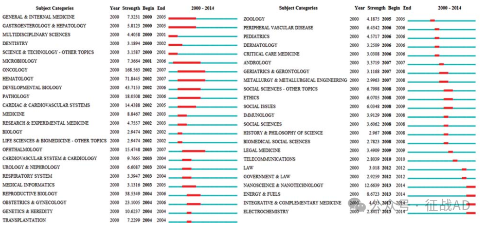 图3. 2000-2014 年间出现爆发的学科类别