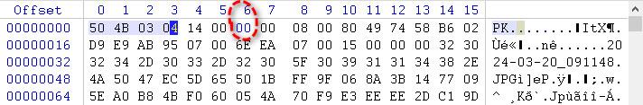 找一个未加密的 ZIP 文件,用 WinHex 或是其他16进制编辑软件打开它。先找到数据区标志 50 4B 03 04 ,然后将第 7 位改成任意奇数。