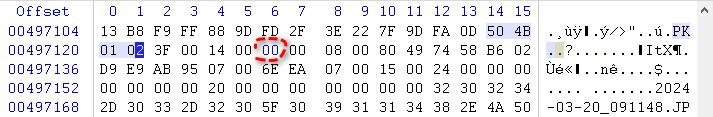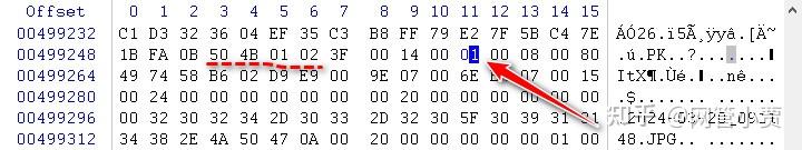 接着找到目录区标志 50 4B 01 02 ,然后将第 9 位改成任意奇数。