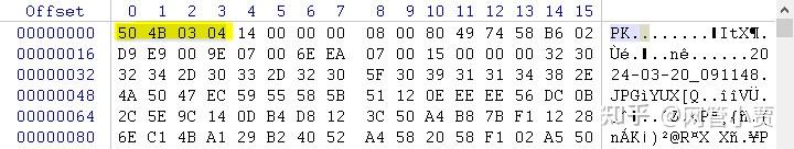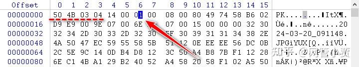 第一个,数据区加密位置,偏移量为 6 ,也就是在数据区开头后面的第 7 位(开头都是从 0 开始的)。这个偏移为 6 的位置,叫做全局方式位标记。来,上图,光靠想象不行的,还得看图。看到没,从数据区 50 4B 03 04 标记往后边数(从 50 开始数),第 7 个就是全局方式位标记。先记住它,后面要用。