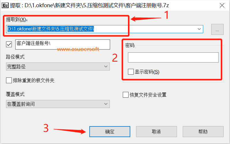 我们先将文件解压路径设置好,然后在密码出输入压缩包的密码,点击确定。压缩包成功解压之后,我们再将文件压缩为不带密码的压缩包即可完成解密。