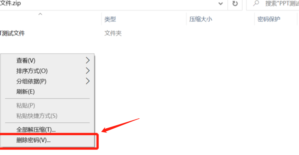 然后会出现一个压缩包名称一样的文件夹,我们在文件夹中的空白处点击鼠标右键,选择最下面的删除密码