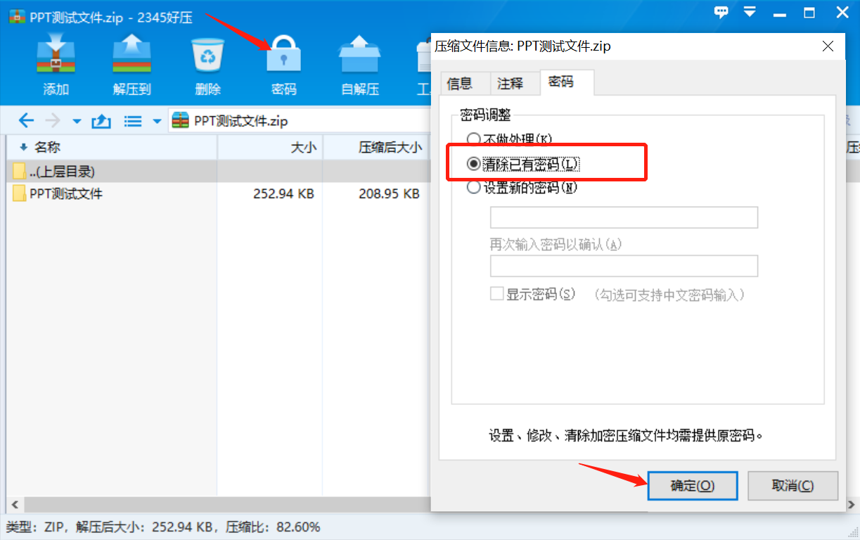 最后,在弹出的密码提示框中,输入zip压缩包密码点击确定,就可以删除zip密码了。