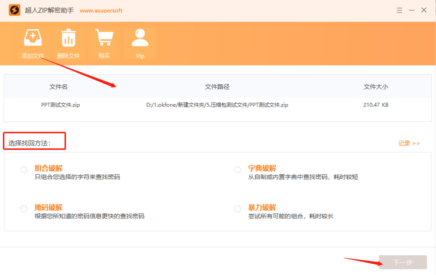 方法四:但是如果我们忘记了密码或者没有密码,那我们就不能使用以上方法删除zip密码的,我们需要先找回密码才能够继续删除密码。找回密码,我们可以自己尝试输入不同的密码直到找到正确的密码也可以使用工具帮我们找回密码,比如超人ZIP解密助手,四种方法支持我们找回密码。