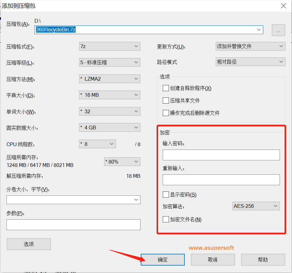 在压缩文件设置界面,我们可以看到有加密模块,在这里我们设置压缩包密码,点击确定就可以开始压缩带有密码的压缩包了。