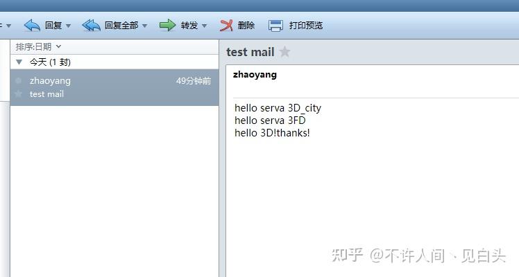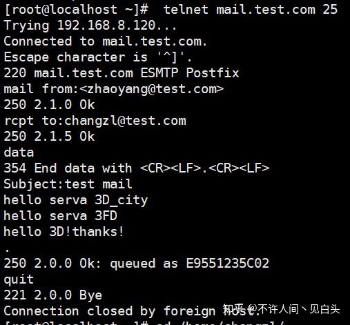 Connected to mail.test.com. Escape character is ’^]‘. 220 mail.test.com ESMTP Postfix #执行telnet mail.test.com 25就会显示上面的内容 表示telnet连接成功 mail from:<> #复制上面一行的代码的,表示邮件发送者 250 2.1.0 Ok #表示ok rcpt to: #to:后面表示邮件接收者,如果有报错往后面看有解决办法 250 2.1.5 Ok data #data加回车开始编写邮件 354 End data with <CR><LF>.<CR><LF> Subject:test mail #邮件主题 hello serva 3D_city hello serva 3FD hello 3D!thanks! #邮件内容 . #.表示编写结束 发送邮件 250 2.0.0 Ok: queued as 21C5340F1992 #发送成功 quit #退出telnet 221 2.0.0 Bye Connection closed by foreign host.