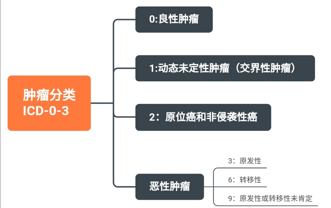 WHO国际卫生组织在《国际疾病分类肿瘤专辑》第三版(ICD-0-3)从形态学编码上将肿瘤大致分了几类:良性肿瘤、交界性肿瘤(无法定性为良还是恶)、原位癌及非侵袭性癌(肿瘤的最早期)、恶性肿瘤四大类。