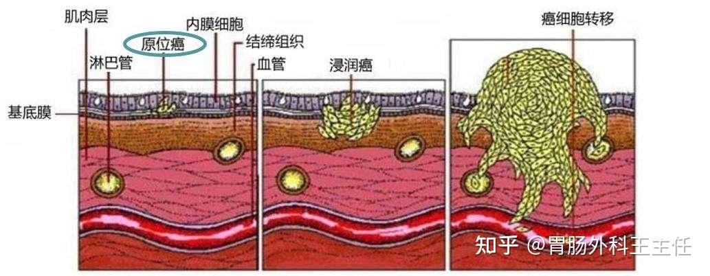 原位癌是一种早期非浸润性癌,它局限于黏膜上皮或者皮肤表皮层内。具体可见参考下图: