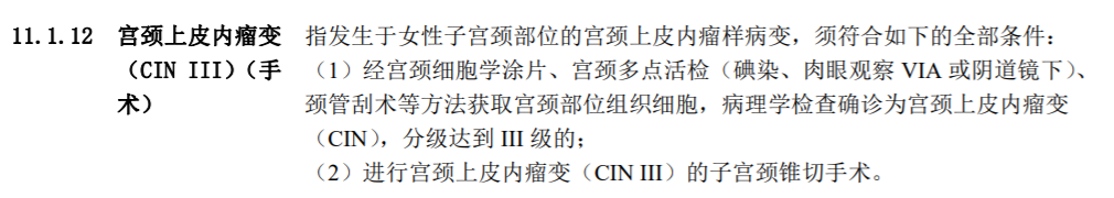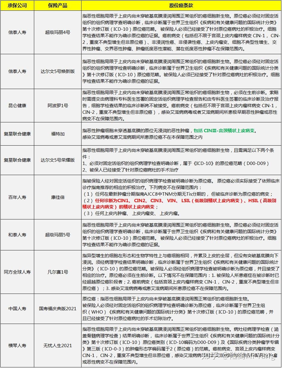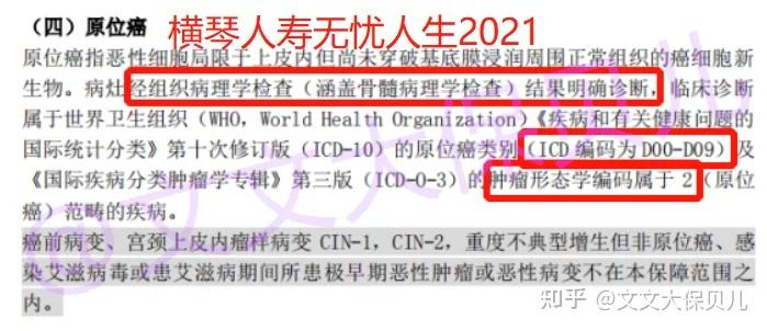 上面这张表格截取了部分保险公司在2021年3月份以后发行的重疾险产品中对原位癌的赔付条件约定。总体上,新规颁布后,保险公司对原位癌的赔付更加谨慎了,明确要求原位癌诊断符合ICD-10原位癌疾病编码;除此之外,有的还要求符合肿瘤形态学编码的描述(比如横琴人寿无忧人寿2021)。不过这些都没有问题,在文章中我们已经得出结论,临床上CIN3给的就是原位癌的疾病编码和原位癌的肿瘤形态学编码。所以,根据条款目前大部分保险公司还是可以按照原位癌去赔付CIN3的。