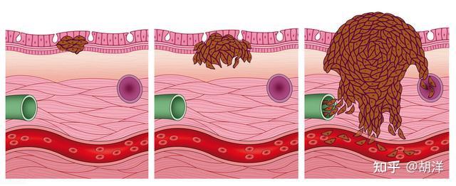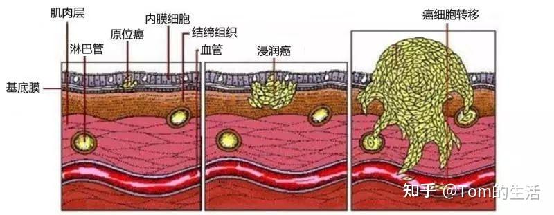 打个比较形象的比喻,血管是人体当中的河流,癌细胞就像池塘里样的鱼,而基底膜就是横隔在池塘和河流之间的堤坝,当池塘距离河流很远的时候,癌细胞是没有丝毫机会跳到河流里游向远方的,但池塘不断的扩大,终于池塘的边界挖到了堤坝里,理论上讲池塘里的鱼已经有机会通过堤坝里的暗道进入河流游向远方发生转移了,相当于到达了微浸润阶段,但这个阶段转移的概率仍然非常低,直到池塘的边界直接把河流的堤坝给挖通了,这时候癌细胞就像池塘里的鱼,有可能会游向远方发生转移了。