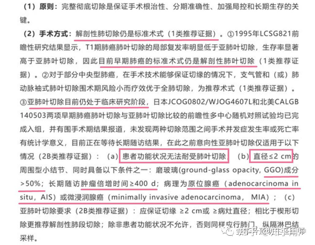 上图大标题是肺腺癌的分类,其实浸润前病变、微浸润性腺癌、浸润性腺癌是并列的小标题,所以能说原位腺癌不是癌吗?而且中国的肺癌治疗指南里首先是肺癌的标准术式是解剖性肺叶切除加淋巴结清扫(1A类推荐),其中的原位腺癌是可以亚肺叶切除的适应性之一,但是2B类推荐,证据等级小于1A类,也就是说原位腺癌切肺叶更符合原则,没有错!这也是目前肺结节不同医生采取各种不同术式的乱象根源所在: