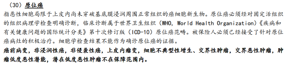 所以肿瘤不存在非良即恶也不存在非恶即良,交界性肿瘤及原位癌是两种特殊的存在。关于这两种特殊的存在,新定义重疾新规中无论是“恶性肿瘤-重度”,还是“恶性肿瘤-轻度”都明确规定了这两种都是不赔付的。