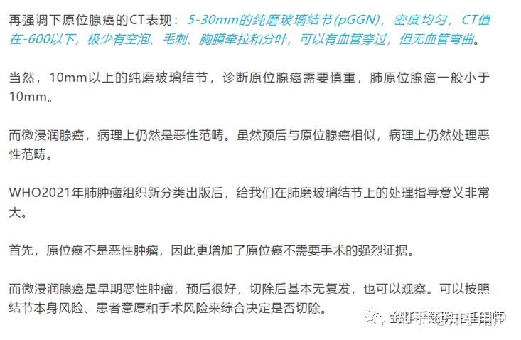 所以总的来看:把非典型增生与原位腺癌剔除出肺恶性肿瘤范畴,在临床上价值有限,最好对手术方式的选择有所改变。真正的大招应该是:把纯磨玻璃结节定义为低危病变,可安全随访(直至出现明显进展,包括范围扩大或实性成份增加)。那才将会是颠覆性的改变!