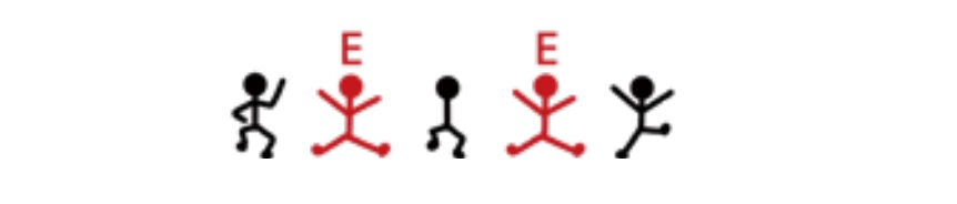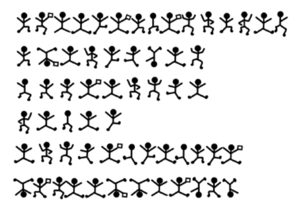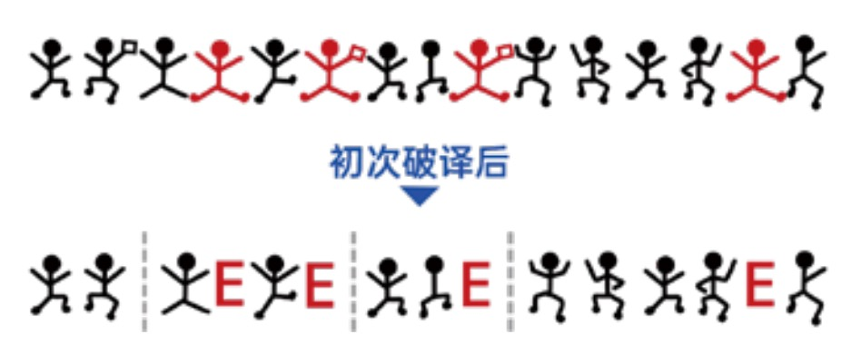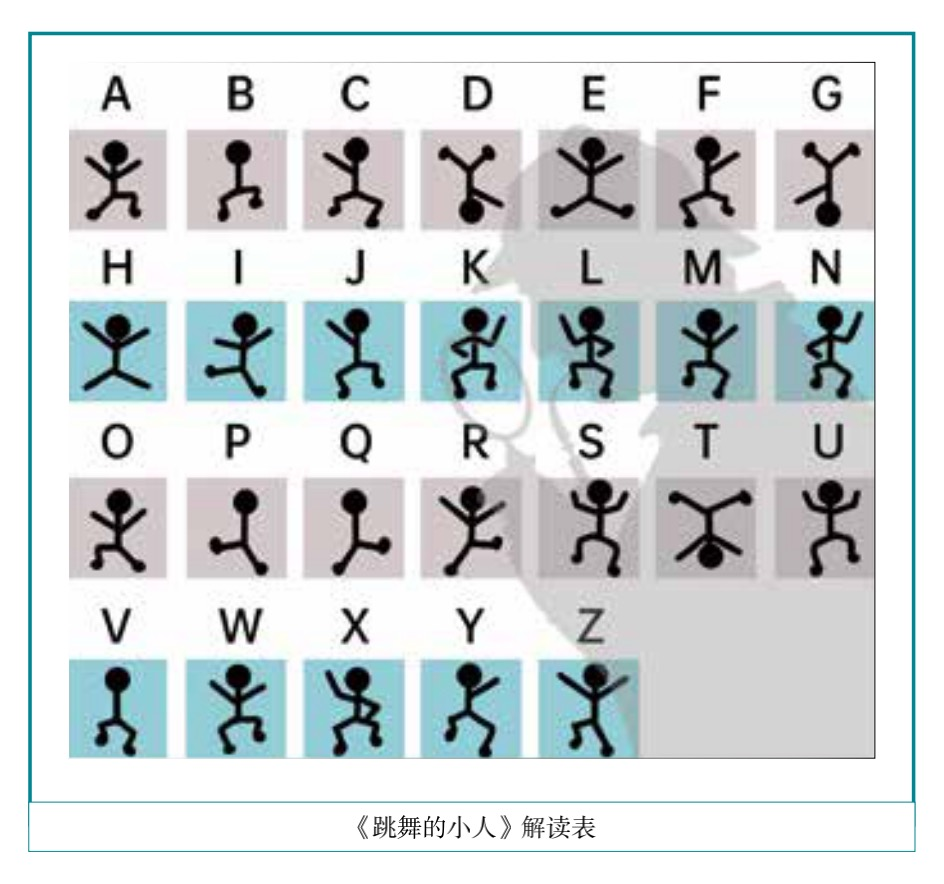 在英文字母中 E 最常见。第一张纸条上的 15 个小人,其中有 4 个完全一样,因此猜它是 E。
