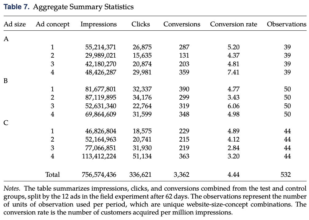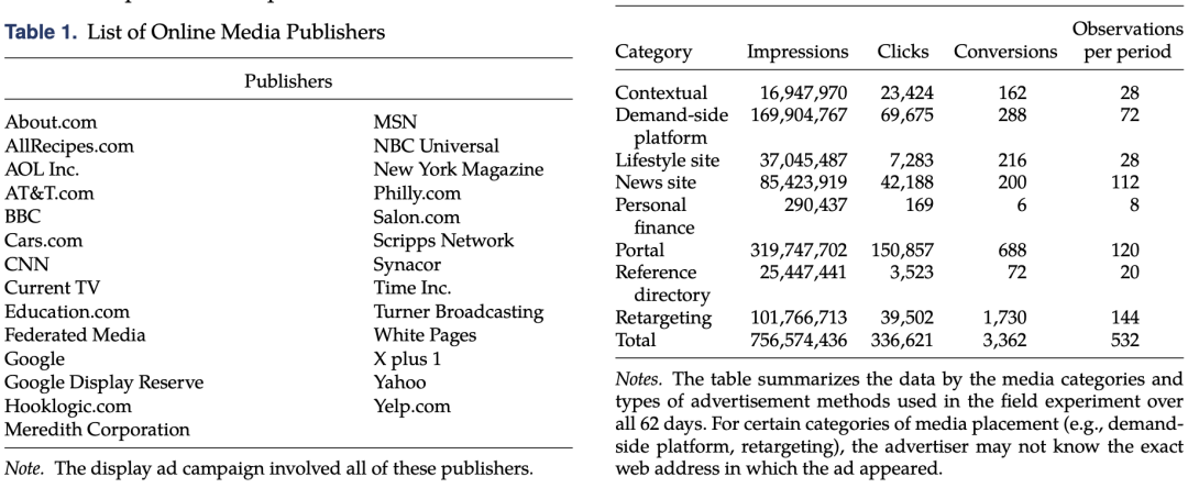 - A field experiment was conducted in collaboration with an American financial services company. The experiment lasted for 62 days and involved multiple ad concepts, sizes, and media placements. The experiment generated 532 units of observational data, including information such as the number of ad impressions, clicks, and conversions.