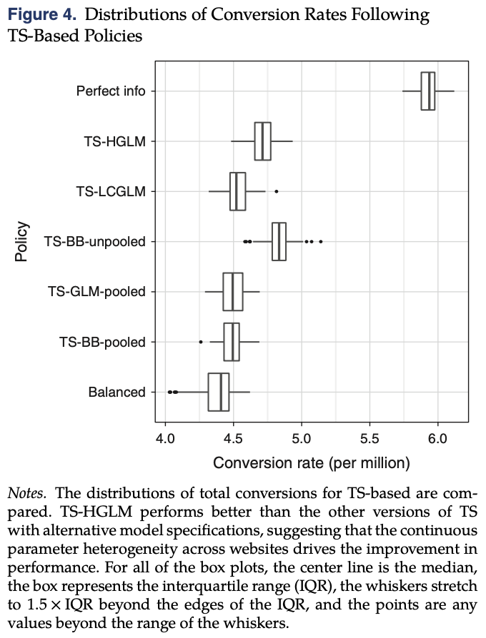 - The field experiment was replicated via simulation to capture the uncertainty of the performance of the two implemented policies (TS - HGLM and balanced). A non - parametric method was used to define the “true” conversion rate, assuming that different policies do not change the true conversion rate of ads but only the allocation of impressions.