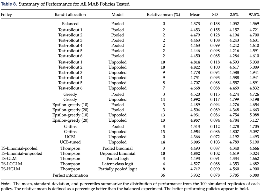 - 发现Gittins和UCB政策的非池化版本以及贪心和epsilon - 贪心的非池化政策在性能上优于TS - HGLM政策,而测试 - 推广政策的非池化版本在特定条件下表现较好,且其性能对选择获胜者的水平和测试期长度敏感。