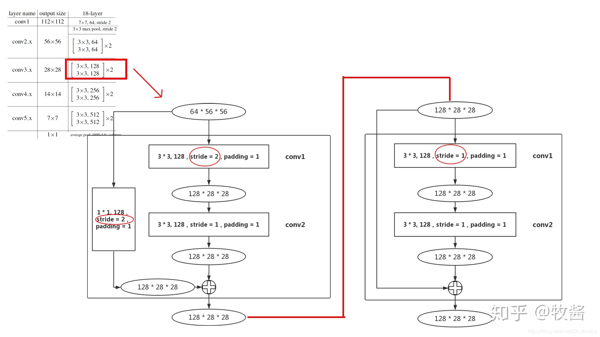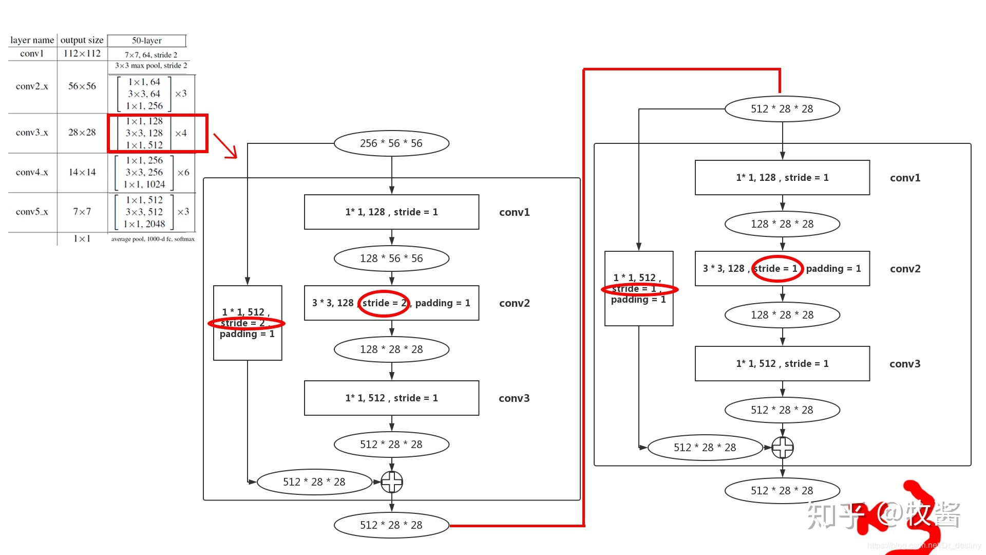 layer2和layer1就有所不同了,首先64×56×56 64 imes56 imes5664×56×56的输入进入第1个block的conv1,这个conv1的stride变为2,和layer1不同(图4红圈标注),这是为了降低输入尺寸,减少数据量,输出尺寸为128×28×28 128 imes28 imes28128×28×28。