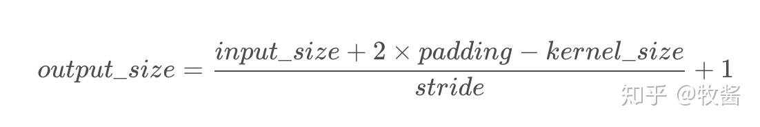 这些都了解之后,图中所示结构就已经很清楚了,顺便提一句,卷积层的输出尺寸(单边)是这么计算的: