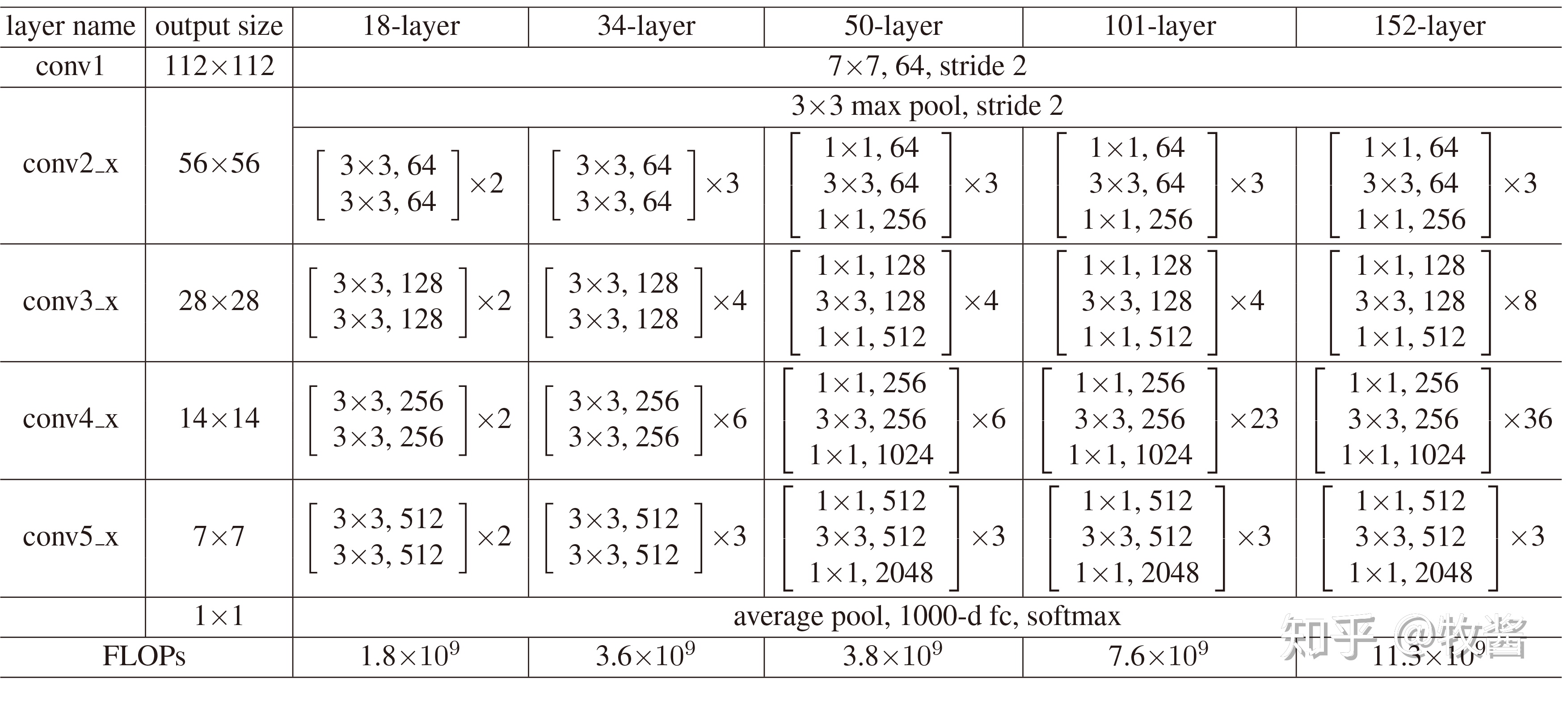 首先,ResNet在PyTorch的官方代码中共有5种不同深度的结构,深度分别为18、34、50、101、152(各种网络的深度指的是“需要通过训练更新参数”的层数,如卷积层,全连接层等),和论文完全一致。图1是论文里给出每种ResNet的具体结构: