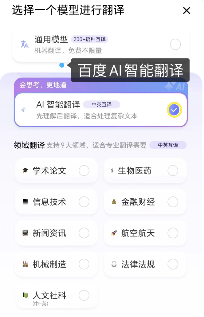 AI大模型翻译是百度翻译研发的新一代大模型翻译技术,拥有像人一样的思考、查证、理解能力。多数情况下,翻译更准确、译文更流畅。